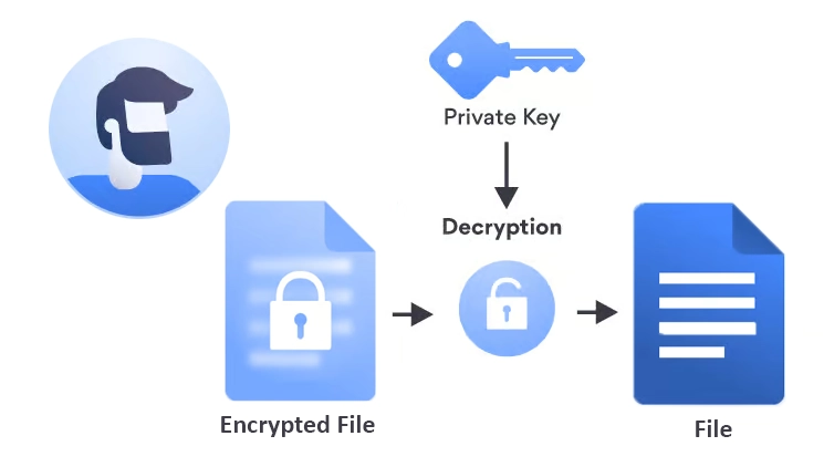 O destinatário, usando a chave privada e uma senha não compartilhada, descriptografa os dados com segurança.